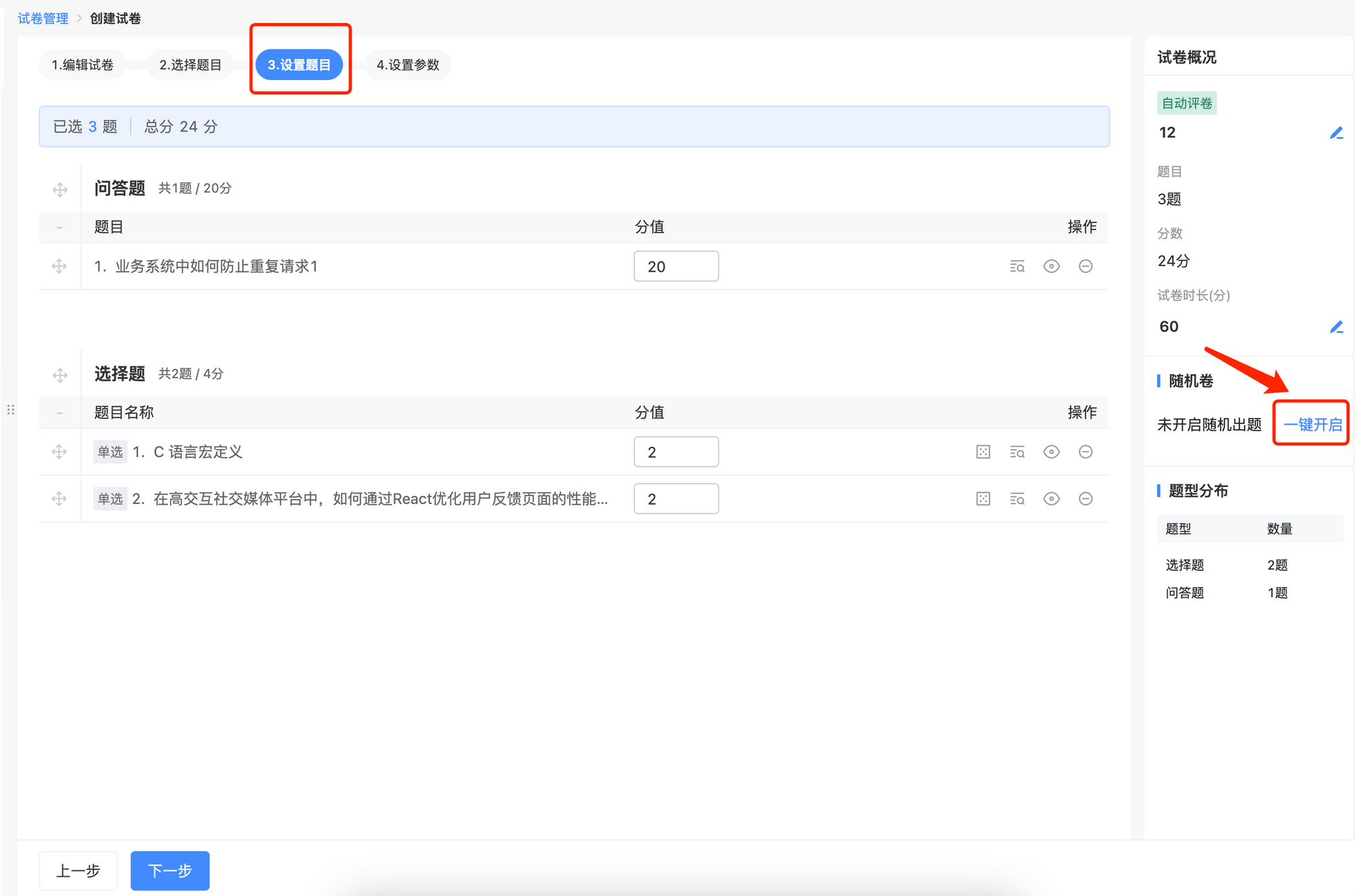 3. 进入下一步【设置题目】,点击“一键开启”随机出题功能。设置完成后,在发卷时系统会随机抽取相似题目生成试卷。